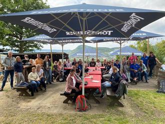 BAD BODENDORF. Am Samstag, 23.08.2025 trafen sich die Mitglieder der KG Rievkooche Bad Bodendorf zu ihrem Sommerfest. Ausgangspunkt und Treffpunkt war der Bahnhof in Bad Bodendorf. Hier fanden sich bei leider etwas herbstlichen Temperaturen 40 wanderfreudige Mitglieder ein, die dann über den Rotweinwanderweg Richtung Lohrsdorf aufbrachen. Hier erwartete sie eine Stärkung in fester und flüssiger Form und glücklicherweise auch ein Unterstand, da es in diesem Zeitpunkt leider etwas zu regnen begann. Gut gestärkt nahm die Gruppe den 2. Teil der Wanderung in Angriff und so ging es weiter zum Winzerhäuschen. Hier angekommen wurden die Wanderer mit gutem Wetter, Wein und leckeren Winzerplatten belohnt.