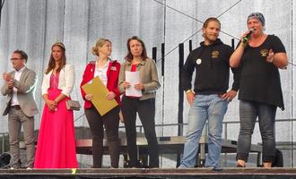 BAD BREISIG.AK. Der zweite Tag des Benefiz-Festivals startete bei Nieselregen mit Grußworten von Landrätin Cornelia Weigand und Bürgermeister Marcel Caspers, die beide die Bedeutung von Kultur gerade in schwierigen Zeiten hervorhoben und die Leistungen der Kulturinitiative „Breisig Live“ würdigten. Frau Diema von der Postcode-Lotterie, einem der Hauptsponsoren, überreichte an Alex Heer und Robert Czaja von „Breisig Live“ einen Scheck über 30.000 Euro, und Brunnenkönigin Corinna fand warme Worte für das gesamte Event.