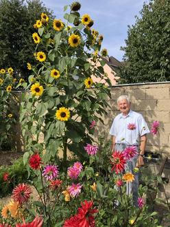SINZIG. Vergangene Woche feierte Alfons Friedsam seinen 91. Geburtstag. Neben zahlreichen Gratulanten aus dem Familien- und Bekanntenkreis freute er sich an diesem Tag besonders über seine selbst gezogenen XXL-Sonnenblumen, die er stolz seinen Gästen zeigte. Eigentlich hatte der betagte Hobbygärtner nie vorgehabt, Sonnenblumen in seinem Garten zu ziehen. Doch vor einigen Jahren zeigten sich erste junge Pflänzchen in seinem Kartoffelbeet. Mal sehen was daraus wird, dachte sich Alfons Friedsam. Mittlerweile wachsen jedes Jahr in seinem Nutzgarten erneut Sonnenblumen, die er neben seinen reichhaltigen Gemüsesorten und weiteren Blumen mit ebenso wachsender Begeisterung hegt und pflegt. In diesem Jahr sind daraus riesige Prachtexemplare mit unzähligen leuchtend gelben Blüten entstanden. Begünstigt durch den Regen der vergangenen Wochen misst die größte Sonnenblume mittlerweile viereinhalb Meter. Vorsichtshalber hat der rüstige Senior seine XXL-Sonnenblumen gestützt und angebunden, damit sie nicht umknicken. „Das ist der größte Geburtstagsstrauß, den ich jemals zum Geburtstag erhalten habe“, freut sich Alfons Friedsam.