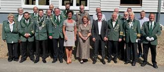 Die Rheinecker Schützen mit den Ehrengästen (ohne Tracht) v.l.vorne: Petra Schneider (MDL CDU), Susanne Müller (MDL SPD) und Bürgermeister Marcel Caspers. v.l. hinten: Tischlermeister Peter Nonn, Pastor Günter Marmann, Wilfrid Scheffler (FWG) Norbert Heidgen (CDU) vor der renovierten Schützenhalle