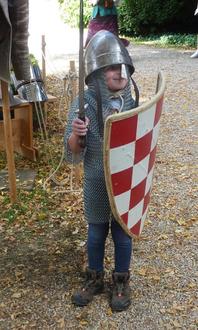 Fabian wurde kurzerhand in den Ritterstand erhoben -aber die ganze Montur mit Kettenhemd und Helm war recht schwer.