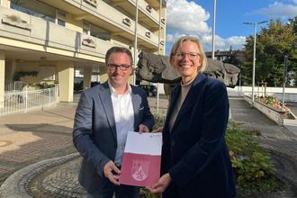 Staatssekretärin Simone Schneider hat dem Bürgermeister der Verbandsgemeinde und der Stadt Bad Breisig, Marcel Caspers, einen Förderbescheid aus dem rheinland-pfälzischen Investitionsstock in Höhe von rund 800.000 Euro überreicht.