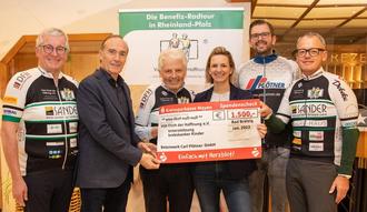 Beim geselligen und informativen Nachtreffen der Vortour-Radler am 7. Januar in Bad Breisig mit vielen Promis aus nah und fern überraschte die Firma Betonwerk Carl Plötner GmbH mit einer Scheckübergabe für die gute Sache. Der neue Vorstand mit dem 1. Vorsitzenden Bernhard Sommer, Vize Hans-Josef Bracht, sowie Wolfgang Schmidgen als Kümmerer Rhein-Ahr und Reckweltmeister Eberhard Ginger nahmen gerne das „Startgeld“ entgegen. Die Firma Plötner vertreten durch Mirjam Plötner-Wall und Oliver Plötner freuten sich, eine Spende in Höhe von 1.500 Euro in gute Hände der VOR-TOUR der Hoffnung überreichen zu können, in der Gewissheit, dass sie dort zu 100 Prozent ankommt, wo sie gebraucht werden.