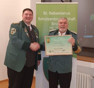 Danach fand die Generalversammlung mit Neuwahlen und Ehrungen statt. Brudermeister Berthold Winkens begrüßte die Teilnehmer, insbesondere den amtierenden Alterskönig Toni Scheuer und Jungschützenprinz Fabian Schig. Im Anschluss nahm Berthold Winkens die Totenehrung vor.
