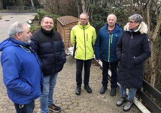 Über die aktuelle Gewässerpflege des Mühlgraben im Bereich Schubertstraße in Bad Bodendorf berichtete Helmut Pauly (li.) den Ratsmitglieder der Freien Wähler (v.re.) Melanie Hürlimann, Heinrich Ax, Roland Janik und Alexander Albrecht.