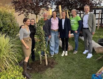 Das Team hinter der Planung, Gestaltung und Umsetzung des PikoParks: Naturgartenplanerin Dr. Anke Wallraff-Beck, WILA Bonn e.V. Carola Lehmann, Garten-Landschaftsbauer Jörg Deimling, WILA Bonn e.V. Michaela Shields, Klimaanpassungsmanagerin Luzia Heinzelmann, Garten-Landschaftsbauerin Jörina Deimling, Bürgermeister Andreas Geron