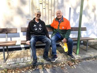 Der Sinziger Ortsvorsteher Reiner Friedsam und die "rüstigen Rentner", im Bild Herbert Rück (rechts) und freuen sich über die gelungene Ruhebänke Aktion zugunsten der AWO Stadtranderholung.