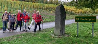 Von Reil ging es in halber Höhe des Hanges durch die gelb gefärbten Weinberge nach Burg/Mosel. Kurz nach dem Ortsausgang wiesen ein Gedenkstein und ein Schild die Gruppe darauf hin, dass 50. Breitengrad überschritten wurde. Nächstes Ziel war der historische Weinort Enkirch. Der Ort wurde 733 zum ersten Mal erwähnt. Neben zahlreichen Fachwerkhäusern aus dem 15. bis 18. Jahrhundert besitzt er zahlreiche klassizistische Bauten aus dem 19. Jahrhundert. In Enkirch begann der steile Aufstieg zu Aussichtspunkt „Rottenblick“, von dem sich ein schöner Ausblick auf Enkirch und die Moselschleuse bot.