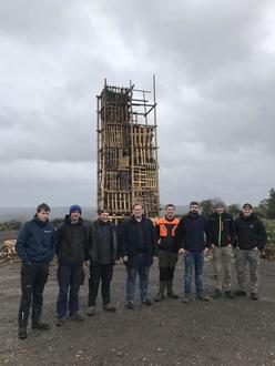 Los ging es in diesem Jahr Ende September mit dem Aufstellen der sechs Stämme. Woche für Woche wuchs das Feuer unablässig in die Höhe. Rund ein Dutzend Helfer opferten zu diesem Zweck einen Großteil ihrer Freizeit und waren an der Baustelle zu finden.