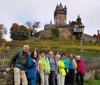 SINZIG. Am 26.10. konnte Wanderführer Konrad Waßmann bei nebligem Herbstwetter 7 Wanderinnen begrüßen, die bereit waren, mit ihm einen Seitensprung zu begehen. Ausgangspunkt war Cochem an der Mosel. Eine Variante des langen Cochemer Rittersprungs führt als anspruchsvoller Mosel-Seitensprung von Cochem aus zunächst eigentlich in Serpentinen hinauf zum Aussichtspunkt Pinnerkreuz. Doch die Wandergruppe konnte der Verlockung der Cochemer Sesselbahn nicht widerstehen und ließ sich sanft hinauftragen. Dort oben steht das Pinnerkreuz an sehr exponierter Stelle zu Ehren eines Schafhirten, der sein Leben bei der Rettung eines Tieres verlor. Der Blick von hier auf Cochem ist grandios, wenn da nicht der Nebel im Moseltal hängen würde. Schon bald war danach auf ebenem Weg die Wackelay erreicht. Nach der Durchquerung des Enderttals stand der Aufstieg zur Ruine Winneburg an. Weiter ging es hinauf zur Wilhelmshöhe und anschließend über die Ebene und den Antonius Kopf zum Aussichtspunkt Hubertushöhe. Endlich hatte sich der Nebel verzogen und es bot sich ein großartiger Blick auf die sonnenbeschienene Moselschleife bei Cochem, die Eifel und den Hunsrück. Der Abstieg erfolgte durch das Tal der Märtschelt und an der Knippwiese vorbei zur eindrucksvollen Reichsburg. Die letzte Etappe führte hinunter in die von zahlreichen Touristen bevölkerte pittoreske Altstadt von Cochem. Eine muntere Blaskapelle sorgte auf dem Marktplatz für ausgelassene Stimmung. In einem historischen Café fand die 17 km lange Wanderung ein schönes, gemütliches Ende. Die Gruppe war sich einig: So ein Seitensprung ist schön.