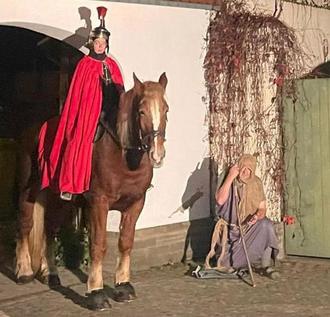 In der Waldorfer Ortsmitte traf St. Martin auf den Bettler und teilte mit ihm seinen wärmenden Mantel, wie es in der Überlieferung erzählt wird.
