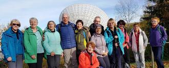 Nach einigen Kilometern gelangten die Wanderfreunde auf den Galaxienweg. Info-Tafeln erklären anschaulich den Aufbau des Weltalls mit seinen unermesslichen Dimensionen. Bald war das Radioteleskop Effelsberg erreicht, ein mächtiges astronomisches Beobachtungsgerät. Die Antenne hat einen Durchmesser von rund 100 Metern und kann komplett gedreht werden. Damit ist das Radioteleskop Effelsberg weltweit das zweitgrößte bewegliche Teleskop seiner Art. Es wird eingesetzt zur Beobachtung von Radiostrahlung aus dem gesamten Kosmos. Die schiere Größe des Gerätes gab Anlass zum Staunen.