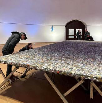 Zu sehen war in der Mitte des Raumes ein 7,50 x 4,50 Meter großes Tafeltuch bzw. Tischdecke mit abertausenden kleinen und an der Wand auf Handtücher gesunkene Bilder,