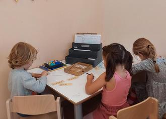 In der Schreibwerkstatt der Kita Abenteuerland arbeiten die Kinder konzentriert und erfahren die Verbindung von Sprache und Schrift.