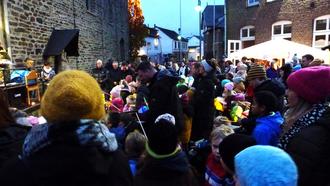 WESTUM. DG. Das war nicht einfach nur ein Fackelzug durchs Dorf. Man hatte den Eindruck, dass sich am späten Sonntagnachmittag fast ganz Westum auf dem Mehrgenerationenplatz traf. Für das leibliche Wohl war mit Waffeln, Würstchen und duftendem Glühwein neben anderen Getränken ebenfalls gesorgt. Die Pänz präsentierten stolz ihre selbst gebastelten Fackeln, und die Erwachsenen fanden gute Gelegenheit zum nachbarschaftlichen Smalltalk. Dem Anlass entsprechend wurde ein kleiner Wortgottesdienst mit von Kindern verlesenen Fürbitten zelebriert, bei dem auch die Geschichte von St. Martin vorgetragen wurde. Und natürlich erschallten die altbekannten Martinslieder über den Platz. Klassenweise wurden die Kinder aufgerufen, die bei der Fackelprämierung die ersten Plätze belegt hatten. Ja, und dann ging es auch schon los, St. Martin (dargestellt von Bianca Stollwerk vom Gerhardshof) führte auf ihrem schönen Pferd die Schar fröhlicher Kinder zusammen mit den Erwachsenen durch Westum. Die Löschgruppe der Freiwilligen Feuerwehr war mit einer starken Mannschaft vertreten und sicherte den Umzug. Und damit das mit dem Singen auch gut klappt, begleitete eine Abordnung der Rhein-Ahr-Spatzen das Ganze musikalisch. Als der Zug sich wieder dem Mehrgenerationenplatz näherte, loderte auf halber Höhe zum Mühlenberg hin gut sichtbar das Martinsfeuer auf. Ein schöner alter Brauch, der bei kühlem, aber trockenem Wetter Spaß und Unterhaltung für Jung und Alt bot.