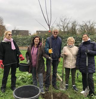 Pflanztag des Beirates für Migration und Integration im Gemeinschaftsgarten der Stadt Sinzig (v. l.) Sozialraumkoordinatorin Sonja Wuttke, die Beirats-Vorsitzende Ana Maria De Sousa Baptista Tomé, Ortsvorsteher Reiner Friedsam sowie Ljubica und Milesa Gajicic.