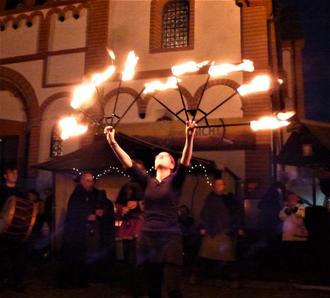Auf einmal tauchte der Nikolaus persönlich auf und verteilte Gaben an die Kleinen. Die schienen vor dem älteren Herrn mit dem langen weißen Bart keine Scheu zu haben und ließen sich auch schon mal auf den Arm nehmen. Nach Einbruch der Dunkelheit kündigte mittelalterliche Musik ein besonderes Schauspiel an: Die Feuershow. Hier wurden präparierte Feuerstäbe durch die Luft gewirbelt und boten ein besonderes Lichtspektakel. Die Jagdhornbläser Remagen läuteten anschließend das Ende des Weihnachtsmarktes ein. Das Wetter spielte mit und so konnten alle wieder ein schönes vorweihnachtliches Fest genießen.