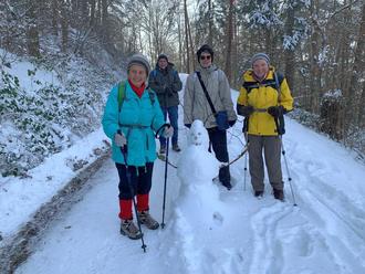 REMAGEN.Eifrige Wanderfreunde des Eifelvereins Remagen machten sich zu früher Stunde auf, um an der beliebten Winterwanderung der Ortsgruppe Antweiler des Eifelvereins teilzunehmen. Verheißungsvoll leuchtete das Morgenrot schon am Treffpunkt am Bahnhof Remagen. Die einstündige Anreise an die Oberahr war nicht ganz ohne Tücken, denn in den Höhenlagen waren einige Schneewehen auf der Straße zu überwinden. Am Ziel angekommen, reichte die Zeit noch für eine Tasse Kaffee am warmen Bullerofen in der vereinseigenen Blockhaushütte. Um 10 Uhr startete die aus verschiedenen Ortsgruppen des Eifelvereins zusammengesetzte Gruppe zur Wanderung durch die tief verschneite Winterlandschaft. Dank des Einsatzes der Mitglieder der Ortsgruppe Antweiler waren die Wege auf der Strecke am Tag zuvor gut präpariert worden und mühelos begehbar. Zunächst ging es durch den verzauberten Wald entlang der Ahr. Nach ca. einem Drittel der Strecke gab es eine kurze Rast mit Kaffee und Glühwein. Dann erfolgte der Anstieg. Von den Höhenlagen in ca. 450 m Höhe boten sich spektakuläre Ausblicke auf die Hohe Acht, die Nürburg und den nahe gelegenen Aremberg, mit 623 m Höhe der höchste Berg des Ahrgebirges. Am Ende der Tour stärkten sich die Wanderer und Wanderinnen in der warmen Vereinshütte an der legendären Erbsensuppe und köstlichem selbst gebackenen Kuchen. Nicht ohne vorher die freiwilligen Helferinnen und Helfern der Ortsgruppe Antweiler zu loben und ihnen für ihren Einsatz zu danken, traten sie zufrieden die Rückreise nach Remagen an. Sie hatten Glück, denn in der folgenden Nacht setzte starkes Tauwetter ein. Am nächsten Morgen war die weiße Pracht weitgehend verschwunden.