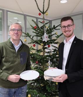 RESI SCHWERTER BAD BREISIGG - Winfried Nett (l.) freut sich sichtlich über den Erhalt der neuen Teller aus den Händen von Florian Schneider, stellvertretender Leiter der Kreissparkassengeschäftsstelle in Bad Breisig.