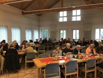 Nach der Andacht ging es in den weihnachtlich geschmückten Pfarrsaal, wo 50 Frauen bei Kaffee und Kuchen in besinnlicher Runde zusammensaßen. Auf die weihnachtliche Zeit stimmten Doris mit Partner, bekannt durch Auftritte in der Schäferhütte, mit Akkordeon und Gitarre zum Mitsingen der altbekannten Weihnachtslieder ein. Weihnachtliche Geschichten, teils besinnlich und teils humorvoll von Ingrid Breuer vorgetragen, rundeten das Programm ab.