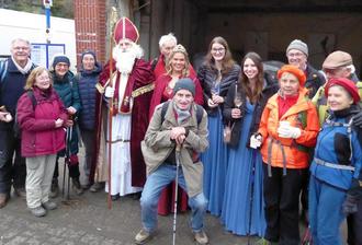 Über wenig begangene Waldwege, teils mit umgefallenen Bäumen, erfolgte der mühsame Aufstieg zum „Dernauer Platz“. An der Wegkreuzung im Wald war der höchste Punkt der Wanderung erreicht. Zeit für eine Erholungspause der erschöpften Wanderer. Dankbar nahmen sie die vorgewärmten Sitzplätze einer aufbrechenden Wandergruppe an. Nach der Stärkung ging es weiter über bequeme Waldwege. Bald wurde der Blick ins Ahrtal auf Rech frei. Nach der Durchquerung des Ortes und kurzem heftigem Anstieg war die Hütte auf der Saffenburg erreicht. Bei warmem Glühwein ließ sich hier angenehm die schöne Aussicht genießen. In heiterer Stimmung ging es anschließend abwärts nach Mayschoß. An der Bushaltestelle überraschten die Wartenden der Nikolaus und Weinkönigin Lilian Schmitt mit ihren beiden Weinprinzessinnen Jule und Melina. Ein gelungener Abschluss des geselligen Wandertags.