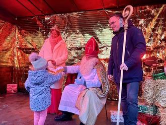 Im Anschluss bekam jedes Kind einen kleinen Weckmann geschenkt. Stadtbürgermeister Marcel Caspers (rechts) durfte dem heiligen Mann assistieren.