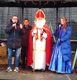 Bei der Eröffnung des Weihnachtsmarktes in Bad Breisig (v.li.): Bürgermeister Marcel Caspers, Andreas Windscheif (Werbegemeinschaft), der Nikolaus und Brunnenkönigin Sophie. Nach der Eröffnung traten „Cocajine“ und Daniela Dilow mit Gesang auf der Bühne auf.