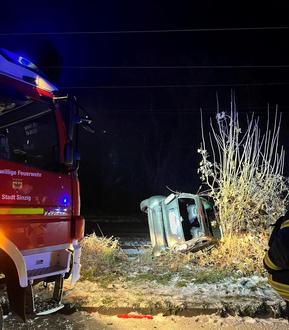Der zweite Einsatz ereignete sich um 22.54 Uhr, erneut rückten beide Löschzüge aus. Auf schneeglatter Straße kam es in der Eisenbahnstraße in Sinzig zu einem Verkehrsunfall. Ein PKW war von der Fahrbahn ab- und auf der Seite liegend im Gleisbett der Bahnstrecke zum Stehen gekommen. Die zwei Insassen wurden leicht verletzt und durch die Feuerwehr bis zum Eintreffen des Rettungsdienstes medizinisch erstversorgt. Sinziger Feuerwehrkräfte zogen den PKW mit Hilfe eines Löschfahrzeugs aus dem Gleisbett, wodurch die Einschränkungen im Zugverkehr schnellstmöglich behoben werden konnten.