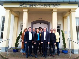 Führungswechsel in den Römer-Thermen der Stadt Bad Breisig. Stadtbürgermeister Marcel Caspers und der scheidende Geschäftsführer Bernd Schmitz, begrüßen Esther Zimmermann, die designierte Geschäftsführerin der Römer-Thermen im Kreis von Vertreterinnen und Vertretern aus Politik und Verwaltung an ihrer neuen Wirkungsstätte.