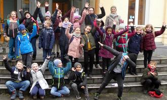 Kripper Grundschulklasse vor dem Weltladen in Remagen