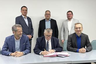 Wolfgang Horrmann (Beigeordneter Stadt Bad Neuenahr-Ahrweiler), Dr. Alexander Saftig (Landrat des Kreises Mayen-Koblenz bis 31.12.2024) und Sinzigs Bürgermeister Andreas Geron (vordere Reihe v.l.) gemeinsam mit Dirk Weber (Werkleiter Eigenbetrieb Wasserwerk), Stefan Friedsam (Werkleiter WVZ Maifeld-Eifel) und Carsten Lohre (Werkleiter Stadtwerke Sinzig) (hintere Reihe v.l.) bei der Vertragsunterzeichnung