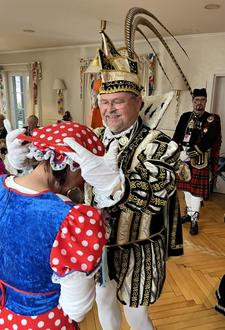 Die DRK-Mitarbeitenden Petra Schütz und Sabine Gremmler waren glücklich, dass sie nach drei Jahren wieder mit den Bewohnerinnen und Bewohnern feiern konnten und freuten sich über das karnevalistische Stelldichein der Narrenschar im Weißen Ross. Zum Dank erhielten Prinz Peter III. und Prinzessin Drea I. ein kleines Präsent. Aber auch Schütz und Gremmler gingen nicht leer aus: Als Anerkennung für ihre Arbeit zum Wohle der Senioren wurden die beiden langjährigen Mitarbeiterinnen mit dem Sessionsorden und einem Bützchen von Prinz Peter III. geehrt. Nach dem rund halbstündigen Stelldichein zogen die Narren unter Applaus der rüstigen Rentner weiter, um weitere Tagestermine wahrzunehmen.