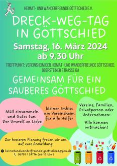 Unter dem Motto "Gemeinsam für ein sauberes Göttschied" veranstalten die Heimat- und Wanderfreunde Göttschied e.V. am Samstag, den 16. März 2024, einen Dreck-Weg-Tag für den Stadtteil Göttschied. Die Aktion ruft Privatpersonen, Familien, Institutionen und Vereine dazu auf, sich gemeinsam für die Verschönerung des Stadtteils einzusetzen und ihn von Müll zu befreien.