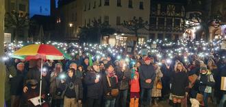 Wie in vielen anderen Städten gingen auch in Idar-Oberstein Menschen für den Erhalt der Demokratie auf die Straße. Auf Initiative des Kulturvereins „Die Schnecke“ kamen 1000 Menschen auf den Obersteiner Marktplatz. Begleitet von Sonja Gottlieb, die Lieder von Konstantin Wecker und das traditionsreiche „Die Gedanken sind frei“ sang, sowie Gedicht- und Textvorträgen von Sonja Redmer und dem 14-jährigen Noel Nees riefen OB Frank Frühauf, Jutta Walber, die Superintendentin des Kirchenkreises Obere Nahe, Steffi Loth, die Landesvorsitzende der Polizeigewerkschaft, und der Bundestagsabgeordnete Dr. Joe Weingarten dazu auf, auch im Alltag immer konsequent Rassismus, Antisemitismus und demokratiefeindliche Äußerungen entgegenzutreten, denn einen Rückfall in die Zeit von 1933 bis 1945 mit Diktatur, Holocaust und der Vernichtung Andersdenkender dürfe es in Deutschland nicht mehr geben. Zum Abschluss tauchten die Teilnehmerinnen und Teilnehmer der größten Kundgebung, die es seit Bestehen der Bundesrepublik in Idar-Oberstein gegeben hat, den Marktplatz mit ihren Handys zu dem Wecker-Lied „Sage Nein!“ in ein Lichtermeer.