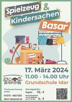 Der Förderverein der Grundschule Idar veranstaltet am 17.03.2024 von 11.00-14.00 Uhr einen Kindersachenbasar in der Heidensteilhalle. Neben gut erhaltener Kinder- und Teeniekleidung, Babybedarf und Spielzeug ist natürlich auch für das leibliche Wohl gesorgt.