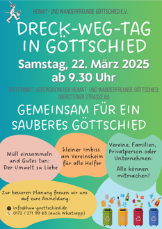 Am Samstag, den 22. März 2025, ist es wieder soweit: Der Dreck-Weg-Tag in Göttschied steht an. Ab 9:30 Uhr sind alle eingeladen, gemeinsam mit den Heimat- und Wanderfreunden Göttschied für eine saubere Umwelt zu sorgen.