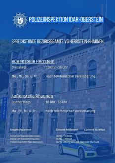 Die Polizeiinspektion Idar-Oberstein informiert die Bürgerinnen und Bürger über die neuen Sprechzeiten der Bezirksbeamtinnen. Die beiden Außenstellen werden zukünftig wie folgt besetzt sein: