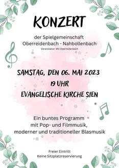 Der Musikverein Oberreidenbach lädt in Spielgemeinschaft mit dem Musikverein Nahbollenbach zum Konzert am Samstag, 06. Mai, in die evangelische Kirche in Sien ein. Die Veranstaltung beginnt um 19 Uhr. Der Eintritt ist frei, wir freuen uns aber über eine freiwillige Spende.
