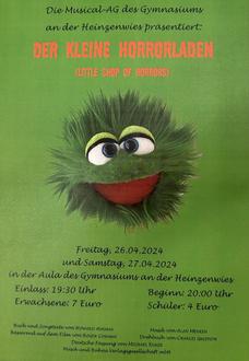 Die Musical-AG des Heinzenwies Gymnasiums führt am 26. und 27.04.2024 „Der kleine Horrorladen“ auf. Der schüchterne Angestellte in Mushniks Blumenladen, Seymour, wird durch tragische Umstände zum Helden der Geschichte. Um seiner heimlichen Liebe, seiner Kollegin Audrey, zu imponieren, züchtet er eine besondere Pflanze, die Audrey Zwo. Das Wachstum dieser komischen fleischfressenden Pflanze verläuft aber nicht so, wie geplant und mit dem Futter muss Seymour immer einfallsreicher werden. Lassen Sie sich überraschen, wie er die immer größer werdenden Probleme löst.