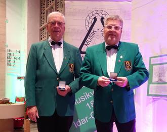 Daher ließ es sich Vorsitzender Günter Heppner (MV 1861 Idar-Oberstein) nicht nehmen, zwei verdiente Musiker im Rahmen des Adventskonzerts zu ehren. Bernd Priebe und Werner Pick erhielten für ihre 65-jährige aktive Mitgliedschaft die Otto-Nitze-Gedächtnismedaille des Kreismusikverbandes Birkenfeld.