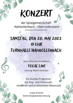 Der Musikverein Nahbollenbach lädt in Spielgemeinschaft mit dem Musikverein Oberreidenbach zur Neuauflage des Konzerts von Sien am Samstag, 20. Mai, in die Turnhalle Nahbollenbach ein. Die Veranstaltung beginnt um 19 Uhr. Der Eintritt ist frei, wir freuen uns aber über eine freiwillige Spende.