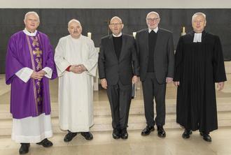 Foto: v.l.n.r. Hauptmann a.D. und Diakon Wolfgang Rhein, Pfarrhelfer Manfred Köhn, Militärpfarrer Andreas Bronder, Militärdekan Monsignore Rainer Schnettker, Evangelischer Militärpfarrer Karl-Martin Unrath im Altarraum der Garnisonskirche St. Barbara vor dem feierlichen Standortgottesdienst