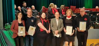 Nach dem modernen Stück „Night Disco“ wurden Musikerinnen und Musiker für ihre langjährige Tätigkeit geehrt: Dieter Gutweiler erhielt von Heinz Wendel den Ehrenbrief des Landesmusikverbandes für 50jährige aktive Tätigkeit. Zusätzlich ist er seit dem 17. (!) Lebensjahr als Kassierer tätig ist. Den Ehrenbrief für 40jähriges Musizieren erhielt Bianca Schneider (derzeit 2. Vorsitzende), ebenfalls schon viele Jahre im Vorstand tätig ist. Sie spielt auch im SBO Klarinette. Vorsitzende Claudia Skodlerak ernannte danach Clarissa Clemens-Dalheimer und Yannik Frech für ihre 25jährige aktive Tätigkeit zu Ehrenmitgliedern.