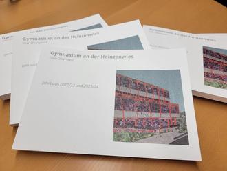 Seit zehn Jahren gibt es das Heinzenwies-Jahrbuch und seit wenigen Tagen liegt die neue Ausgabe der Schuljahre 2022/2023 und 2023/2024 vor. Dass die Corona-Einschränkungen auch in der Schule völlig überwunden sind, zeigt sich auch am Umfang des neuen Jahrbuchs, das beachtliche 188 Seiten umfasst. Wieder lässt das Jahrbuch die vergangenen beiden Schuljahre in vielen Artikeln, Fotos und Kunstwerken von Schülerinnen und Schülern Revue passieren. Es erinnert an Abiturfeiern, gelungene Theater- und Musicalabende, Theaterbesuche, Feste und Feiern, große Sporterfolge, Exkursionen und Fahrten sowie erfolgreiche Wettbewerbe. Anhand einer ausführlichen Chronik kann das Schulleben der beiden Jahre genau nachvollzogen werden. Viel war los in diesen beiden Jahren! Schließlich gibt es auch aktuelle Klassen- und Kursfotos und von den Klassen und Kursen selbst gestaltete Kreativseiten. Insgesamt ist so ein schönes Erinnerungsbuch entstanden, das, solange der Vorrat reicht, im Sekretariat der Schule für 7,50€ erstanden werden kann.