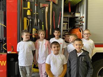 Bei einer ausgiebigen Erkundungstour über das Feuerwehrgelände konnten die Kinder nicht nur einiges über die Aufgaben eines Feuerwehrmanns und seine Kleidung erfahren, sondern auch tolle Dinge über das wichtigste Fahrzeug, sein Feuerwehrauto, kennenlernen. Letzteres sorgte bei den Entdeckern für viel Freude und Begeisterung, sodass alle im Feuerwehrauto einmal Platz nehmen und von dort die Aussicht genießen durften. Nachdem alle Gerätschaften in einem Feuerwehrauto erklärt und erkundet wurden, durften die Kinder das sorgfältige Abrollen eines Feuerwehrschlauchs einüben, um schließlich auch mit diesem über die andere Straßenseite spritzen zu dürfen. Diese Aufgabe bereitete den Kindern eine Menge Spaß und stellte für alle das Highlight des Tages dar. Nach dem gelungenen Vormittag ging es pünktlich zum Mittagessen wieder zu Fuß zurück in die Schule.
