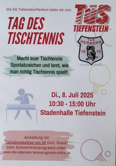 Hier wurde auch fleißig für die Ferienaktion des städtischen Jugendamtes geübt. Tag des Tischtennis am 08.07.2025 in der Stadenhalle in Tiefenstein. Für Kurzentschlossene können auch noch Anmeldungen über folgende Telefonnummer erfolgen: 06781 41354