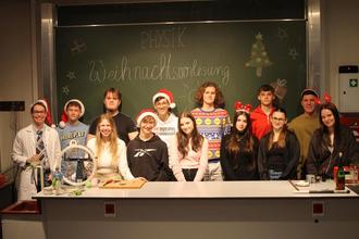 Auch das Weihnachtsfest 2023 musste der große Albert Einstein retten, da der Weihnachtsmann erkrankt war. Physiklehrerin Christine Fell, die die beliebte Weihnachtsvorlesung seit 2014 organisiert, hatte auch in diesem Jahr zusammen mit dem Physik-Grundkurs der MSS 12 ein tolles Programm auf die Beine gestellt: Die kleinen Zuschauer waren begeistert und passten ganz genau auf. Sie freuten sich mit den „Großen“, wenn die Versuche klappten. Als eine Tasse zu Boden rauschte und erst kurz vorm Boden stoppte, konnten sich nur noch die wenigsten auf den Stühlen halten, vor Staunen und Verwunderung. Besondere Highlights, die von vielen Ahs und Ohs begleitet wurden, waren wie immer die tanzenden Sterne und die RakeTEE, bei der ein Teebeutel zur Silvesterrakete wird. Auch wenn die Fünftklässler befanden, dass ein Schokokuss, sei er noch so riesig, nicht für alle als Weihnachtsmenü reiche, so waren sich doch am Ende alle einig, dass die physikalische Weihnachtsvorlesung wieder einmal ein gelungener Abschluss vor den Ferien war. Und so sangen und pfiffen alle gemeinsam zum Abschluss das Weihnachtslied „Jingle Bells".