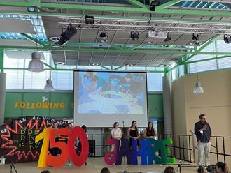Ein kunterbuntes Treiben und Sonnenschein zum Schulfest - dies begeisterte nicht nur Schülerinnen und Schüler, sondern vor allem Eltern und Familien, die einen Blumenstrauß an Darbietungen erleben durften. Von Bühnen-Events wie Showtanz-, Musical- und Poetry-Slam-Shows, bis hin zur neuen Logo-Präsentation im Rahmen des 150jährgen Jubiläums. Die Ausschreibung des neuen Schul-Logos erfolgte im Vorfeld und viele kreative Entwürfe wurden eingereicht. Darüber hinaus sägten und zauberten die Schülerinnen und Schüler (unter der Leitung von Herrn Achim Welsch) in stundenlanger Arbeit ein überdimensionales Jubiläums-Emblem. In der Jubiläumszeitschrift kann man die Geschichte natürlich gerne nachlesen.