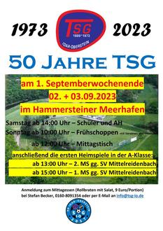 Geht auch die Historie der TSG bis ins Jahr 1889 zurück, wird die TSG Idar-Oberstein in ihrer heutigen Form in diesem Jahr 50 Jahre alt. Denn im Jahr 1973 fusionierten der VfL Enzweiler und der SV Hammerstein zur heutigen TSG Idar-Oberstein. Dies ist ein Grund zu feiern, wenn es auch nicht das historische Jubiläum der TSG ist. Gefeiert wird trotzdem. Gerade weil man diesen Verein schon seit 50 Jahren kennt und er in seinem Jubiläumsjahr in einer Spielgemeinschaft mit dem VfL Algenrodt die Meisterschaft in der B-Klasse II Birkenfeld erringen konnte. So wird im Hammersteiner Meerhafen am 02. und 03.09.2023 ein kleines Sportfest abgehalten. Am Samstagnachmittag messen sich die Jugend- und AH Mannschaften. Der Sonntag startet um 10 Uhr mit einem Frühschoppen mit Gästen und den einheimischen Vereinen. Am Nachmittag stehen dann die ersten Heimspiele in der neu errungenen A-Klasse an. Man trifft auf die Mannschaften des SV Mittelreidenbach. Wer sich zum Mittag mit Rollbraten stärken will, kann sich noch unter info@tsg-io.de anmelden. Die Portion mit Salat zu 9 Euro.
