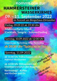 Es ist wieder soweit: Hammerstein feiert Wasserkirmes. Nachdem die beliebte Wasserkirmes in den Jahren 2020 und 2021 pandemiebedingt ausfallen musste, wagt man in 2022 einen Neustart. Von Freitag, 09.09. bis Sonntag 11.09.2022 wird im Festzelt am Ortsmittelpunkt Kirmes gefeiert. Den Anfang macht am Freitagabend eine Mallorca-Party mit Sangria, Mixgetränken und Musik aus der „Dose“. Hauptact am Samstag ist die Band „Spätschicht“ die um 20.30 Uhr das Festzelt zum Feiern bringt. Erstmals wird auch Samstags ein Essen angeboten. Erbsensuppe aus dem großen Kessel wird es um 12 Uhr im Festzelt geben. Den Nachmittag verkürzt man sich mit der ein oder anderen Runde Bingo im Festzelt. Der Sonntag startet dann ganz traditionell mit einem bayer. Frühschoppen. Ab 11 Uhr spielen dazu die Nahetal-Musikanten auf. Mittags kann man sich mit Kartoffelwurst oder Rippchen stärken. Auch eine Kirmesrede steht wieder auf dem Programm. Wer nicht kommt, kriegt nichts erzählt! Lasst Euch überraschen. Für den Nachmittag gibt es noch Kaffee und Kuchen. Kirmes feiern ist auch heute noch in. Zeigt´s uns! Vermehrt wird man den Schlachtruf hören: „Wem ess die Kierb?“ - „Uuus!“